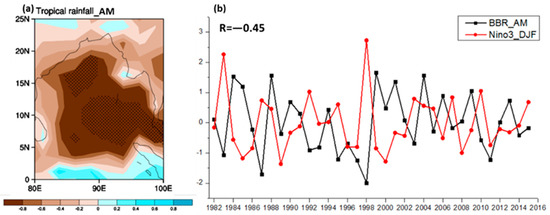 (a) composite anomalies of spring rainfall (unit: mm/day) over the Bay of Bengal in the EP El Niño years; (b) changes in the Bay of Bengal rainfall (BBR) (black squares) and Niño3 (red dots) index for the period 1982 to 2015. The dotted regions in (a) have the rainfall anomalies being statistically significant at the 0.1 level (i.e., p < 0.1) estimated by a local Student’s t-test.