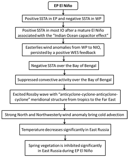 In summary, suppressed convection over the BoB induced by the persistent negative SSTA and WES feedback can excite a Rossby wave from the BoB to the Far East. The strong North and Northwesterly wind anomalies associated with the Rossby wave advect the cold air from Siberia to East Russia, which leads to the remarkable negative SAT anomalies over East Russia and inhibits spring vegetation growth in the EP El Niño years. The possible physical mechanisms are summarized in the schematic diagram shown in Figure 11.