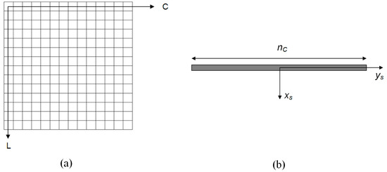 The first reference system related to images is the Image Reference System (IRS). This system is associated with the two-dimensional array of image pixels in a column (C) and line (L) coordinate system. The system’s origin is at the centre of the top left image pixel, as shown in Figure 1a. Another system related to the linear array CCD chip is the Scanline Reference System (SRS), which is a two-dimensional system of coordinates. The origin of the system is located at the geometric centre of the linear array CCD chip. The xs axis is parallel to the L axis and is closest to the flight direction. The ys axis is perpendicular to the xs axis, as shown in Figure 1b.