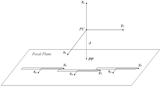 The Camera Reference System (CRS) is a three-dimensional system. Its origin is at the perspective centre (PC) of each camera lens. The xc and yc axes are parallel to the xs and ys axes. The zc axis points upward and completes a right-hand coordinate system [11]. The projection of the PC in the focal plane defines the principal point (PP), and the focal length f is the distance between the PC and PP. An illustration of the CRS and SRS in a focal plane with three CCD chips is shown in Figure 2.