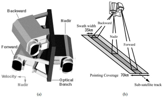 The PRISM sensor provides images with a ground sample distance (GSD) of 2.5 m, and a radiometric depth of 8 bits in a spectral range from 0.52 to 0.77 μm. The sensor is composed of three independent cameras in the forward, nadir and backward along-track directions, as shown in Figure 3a. The simultaneous imaging by the three cameras is called the triplet mode and covers a range of 35 × 35 km on the ground, as shown in Figure 3b. The forward and backward viewings were oriented to ±23.8 degrees with respect to nadir viewing to obtain a base/height ratio equal to one [1].