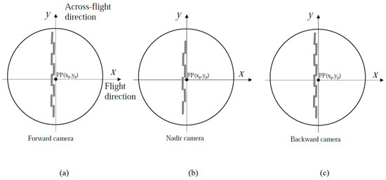 Focal plane arrangements of the ALOS/PRISM forward camera (a), nadir camera (b) and backward camera (c) [6].
