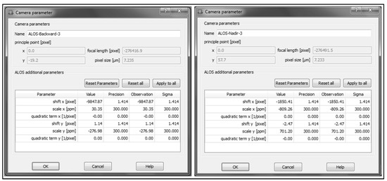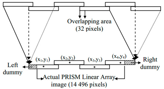For the arrangement of the final image distributed to users, with 14,496 columns and 16,000 lines, a set of four CCD chips was selected. Further pixels were not used at the left and right sides. In Figure 5, an example of the nadir image is shown. An on-orbit geometric calibration, performed by JAXA in June 2007, computed the following parameters: translation values of each CCD chip centre with respect to PP, the focal lengths, the sizes of pixels in the CCD chips, and the PP coordinates x0 and y0. These parameters were provided to some researchers, as can be seen in [6,7]. This dataset is currently embedded in BARISTA software, developed by project 2.1 of the Cooperative Research Centre for Spatial Information [7]. The calibrated values of the focal lengths of the backward, nadir and forward cameras are shown in Table 1.