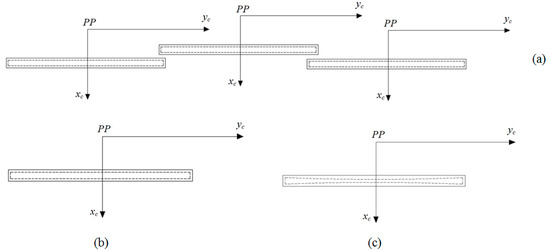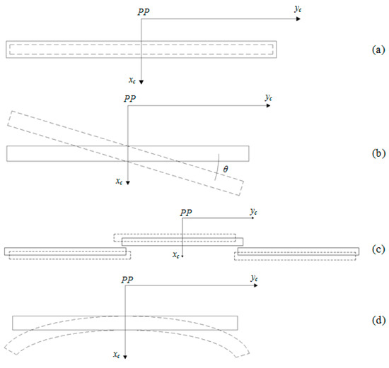 The second set of IOP is related to the CCD chip. These parameters are the change of pixel dimensions in the xs and ys directions, dpx and dpy; the two-dimensional shift a0 and b0; the rotation θ of the CCD chip in the focal plane with respect to its nominal position; and the central angle of the effect of a line bending in the focal plane, considering that the straight CCD line is deformed into an arc. As in the case of the scale variation effect, for a linear array sensor, the parameter dpx can be disregarded. As seen in [6], the CCD chip displacements dx and dy, with respect to the PP, can also be considered IOP related to the CCD chip. Examples of effects of the IOP related to the CCD chips are shown in Figure 9.