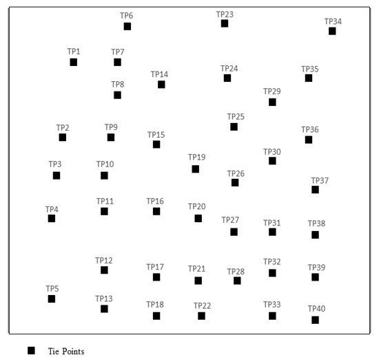 In each triplet, forty tie points were collected and distributed homogeneously. An example is shown in Figure 11, with the distribution of these points in triplet n.1. All points were manually collected in the three images of each triplet; i.e., all points have three image measurements.
