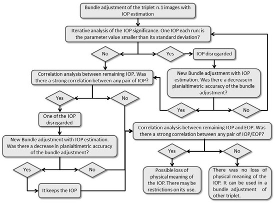 As mentioned, two experiments were performed with triplet n.1. The first one was the conventional bundle adjustment of the triplet. In this experiment, the image’s EOP and the 3D coordinates of control, tie and check points were computed. In the second one, IOP were also estimated. As mentioned in Section 4 and indicated in Figure 14, the analysis of IOP significance was performed iteratively, analysing one IOP each run. After fourteen iterations, a reduced group of significant IOP was defined. The values of estimated significant IOP and their respective standard deviations are shown in Table 5.