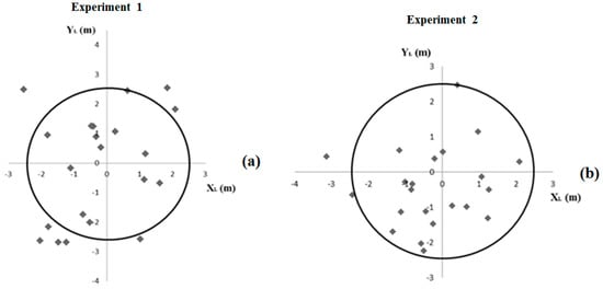 Planimetric discrepancies in check points from experiments 1 (a) and 2 (b).