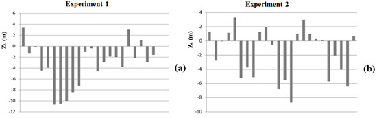 Altimetric discrepancies in the check points from experiments 1 (a) and 2 (b).