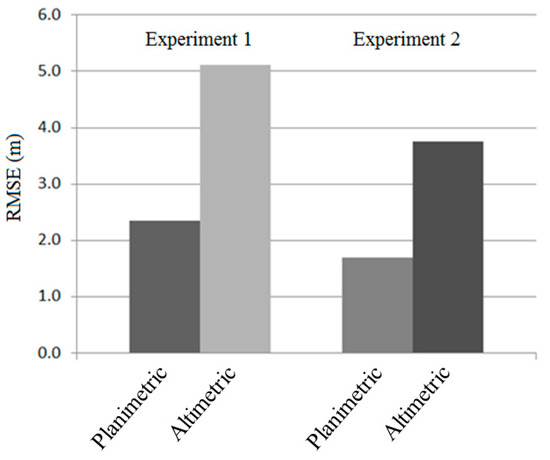 Graphical representation of the planimetric and altimetric RMSE in experiments 1 and 2.