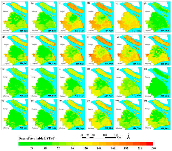 The amount of available daytime LST per month for MODIS Terra 2000–2013 and Aqua 2002–2013, respectively: (a–l) each month at the Terra daytime (TD) overpass; and (m–x) each month at the Aqua daytime (AD) overpass.