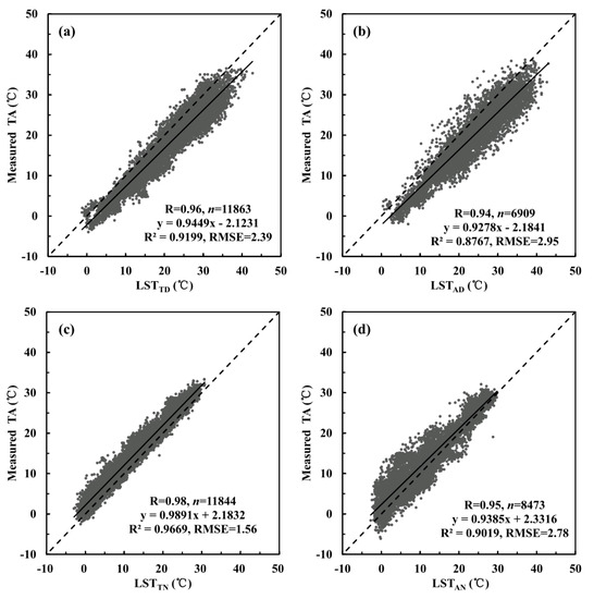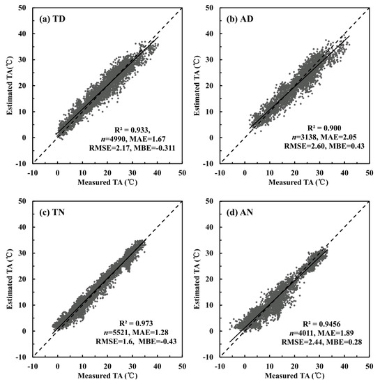 Figure 5 shows the scatter plots between the measured TA from meteorological stations and estimated TA from the stepwise linear regression model based on validation dataset. It is obvious that most of the points were distributed around the line 1:1. This indicates a good agreement between the estimated and measured TA. The MAE values of TATD, TAAD, TATN, and TAAN estimation models are all lower than 2 °C, and the MBE values are −0.31, 0.43, −0.43, and 0.28 °C for TATD, TAAD, TATN, and TAAD estimation models, respectively. Moreover, the R2 values are all greater than 0.90. The RMSE values are 2.17, 2.60, 1.61, and 2.44 °C for TATD, TAAD, TATN, and TAAD estimation models, respectively. It is evident that TA estimated from satellite measurements is more accurate at nighttime, when differential surface heating is absent and the correlation between surface temperature and air temperature is stronger [14,52,57,58].