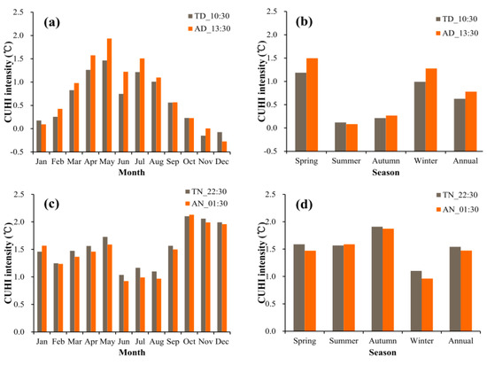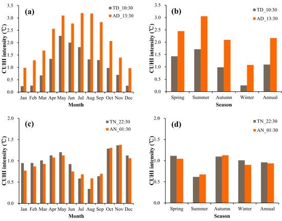 Multi-annual monthly and seasonal mean daytime and nighttime CUHI intensity calculated from satellite-estimated air temperature at the four Terra/Aqua-MODIS overpasses in Shanghai during the period 2000–2013 for Terra and 2002–2013 for Aqua. (a) monthly mean daytime CUHI intensity; (b) seasonal mean daytime CUHI intensity; (c) monthly mean nighttime CUHI intensity; and (d) seasonal mean nighttime CUHI intensity.