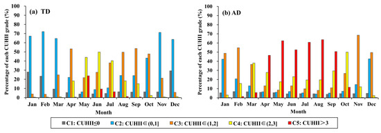 The area percentage of each CUHI intensity grade derived from daytime CUHI Climatological maps for each month at the: (a) Terra daytime overpass (TD); and (b) Aqua daytime overpass (AD).