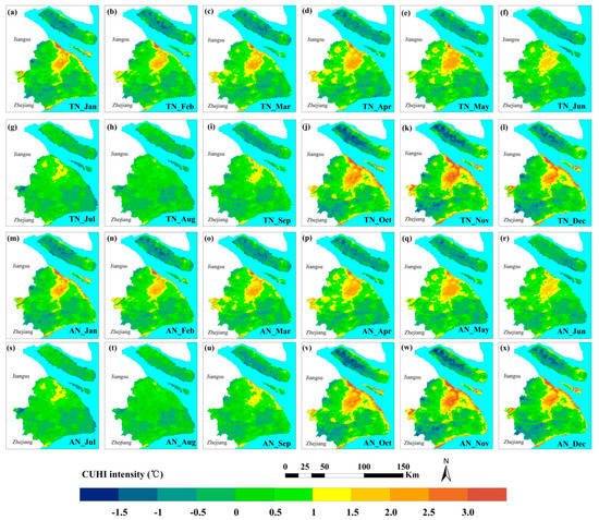 Climatological maps of monthly mean nighttime CUHI intensity calculated form satellite-estimated air temperature. (a–l) each month at the Terra nighttime overpass (TN ~ 22:30) during the period 2000–2013; and (m–x) each month at Aqua nighttime overpass (AN ~ 01:30) during the period 2002–2013 over Shanghai.