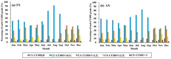 The area percentage of each CUHI intensity grade derived from nighttime CUHI Climatological maps for each month at the: (a) Terra nighttime overpass (TN); and (b) Aqua nighttime overpass (AN).