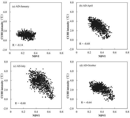 Scatter plots of daytime-CUHI intensity vs. NDVI for four representative months during the period 2002–2013 at Aqua daytime overpass. (a) January; (b) April; (c) July; and (d) October.