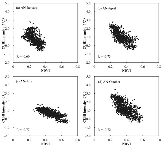 Scatter plots of nighttime-CUHI intensity vs. NDVI for four representative months during the period 2002–2013 at Aqua nighttime overpass. (a) January; (b) April; (c) July; and (d) October.