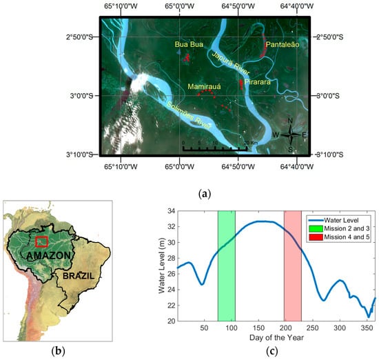 The selected lakes are located in the RDSM (Figure 1a,b). This is the first and largest Sustainable Development Reserve in Brazil dedicated exclusively to the protection of the Amazonian floodplain, comprising approximately 1,124,000 hectares. This Conservation Unit was created by the State of Amazonas in 1996 and is one of the Brazilian sites of the United Nations Ramsar Convention []. It consists of a pristine floodplain inundated by sediment-rich whitewater rivers at the confluence of the Japurá and Solimões rivers, and forms a complex mosaic of seasonally flooded forests, lakes, and channels. Rivers and lakes undergo constant change due to the transport of sediments and organic matter, caused by the annual water level variation of up to 12 m [,,,]. Moreover, the seasonal flooding changes the proportion of suspended and dissolved components in the water by altering its physical-chemical conditions []. Consequently, this affects the ecosystem where these waters circulate []. The flood pulse starts in May and ends in July, while the drought period lasts from September to November. The rising of the water level begins in January and the water starts receding in September. The flood pulse has a monomodal annual pattern (Figure 1c), and the changes in the water level are due to changes in the snowmelt in the Andes and precipitation in the pre-andean region and in the median Amazon basin []. The management plan of the RDSM accounts for more than 5000 lakes in the area, that vary in shape (elongated, circular, and complex), size (from 1.5 ha to 900 ha), and connection to the main rivers and channels, which will influence the lake hydraulic residence and water flow connection during the low water level phase [].