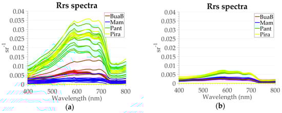 Rrs spectra for each lake in different water phases. (a) Mission 2 and 3 (rising water period); (b) Mission 1, 4, and 5 (receding water period). Each lake is represented by a specific color; Mamirauá in Blue, Bua-Buá in red, Pantaleão in green, and Pirarara in yellow.