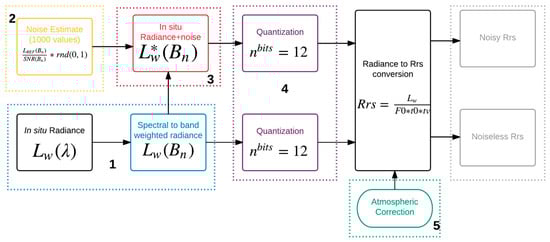 The impact of SNR on the Rrs spectrum was assessed by simulating two datasets: Noisy spectra and noiseless spectra. The input data for the simulation were in situ measurements and the sensor design specifications. The steps for the simulation are similar for both datasets, except for the noise addition, and are described below. It is important to highlight that the simulation assumes optimum conditions such as perfect atmospheric correction, algorithm calibration, and errorless in situ measurements to isolate the noise impact.