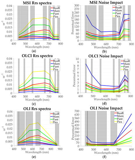 Disregarding the sensor design, the error percentage due to noise is higher in the blue and NIR bands (Figure 4b,d,f) than that in the remaining bands. The relative high impact in the blue band is due to the higher signal from the atmosphere in relation to longer wavelengths. In the Near Infra-Red (NIR) band, nevertheless, the relative error is due to the small SNR (Table 2, Table 3 and Table 4). OLI has the highest relative noise impact, reaching 700% in the NIR, whereas MSI’s maximum value is 250% and OLCI’s maximum value is only 10%. Considering these results, the best algorithms for the retrieval of optical components should include bands between 550 and 700 nm, where relative errors are below 50% in all of the cases. Another important aspect is the relative error for each lake, as a function of water clarity. The highest errors are observed at Mamirauá and Bua-Buá (dark lakes), while the errors at Pirarara and Pantaleão (bright lakes) are below 50% for all bands. The results indicate that before selecting the sensor, it is crucial to consider the Rrs amplitude range, as long as the spatial resolution suits the lake area and shape constraints.