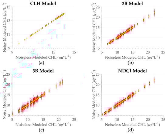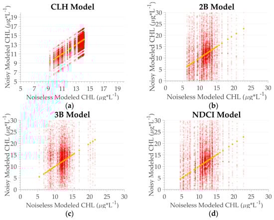 Algorithm performance for the chl-a concentration of the OLCI sensor. (a) CLH; (b) 2B; (c) 3B; (d) NDCI. Circles in red represent the data with noise, circles in yellow the noiseless data. The transparency is based on the frequency distribution, in which opaque indicates a higher frequency, and transparent indicates a lower frequency.