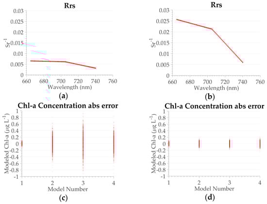 For the 2B, 3B, and NDCI models, the shape of the noisy data distributions seems to be erratic, with different amplitudes for similar concentrations for the three sensors (Figure 5 and Figure 6b–d). The analysis of the in situ spectrum for model 2B, 3B, and NDCI, showed a higher error amplitude (up to 2 μg/L) for spectra with a low Rrs magnitude (<0.005 ) (Figure 7a). On the other hand, for spectra with a higher Rrs (>0.01 ) (Figure 7b), the amplitude is similar to that of the CLH model. Based on these results, the impact of the SNR on the Chl-a estimation is higher in dark lakes such as Mamirauá and Bua-Buá (errors of up to 2 μg/L) (Figure 7c,d) for OLCI. For the MSI sensor, the three proposed algorithms showed a higher impact than that of OLCI due to the poorer SNR, with errors above 10 μg/L.