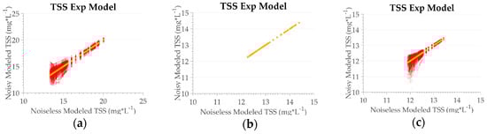 TSS_exp algorithm performance for TSS concentration. (a) MSI sensor; (b) OLCI sensor; (c) OLI sensor. Circles in red represent the data with noise, circles in yellow noiseless data. The transparency is based on the frequency distribution, in which opaque indicates a higher frequency, and transparent indicates a lower frequency.