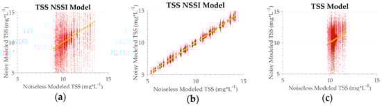 TSS_NSSI algorithm performance for TSS concentration. (a) MSI sensor; (b) OLCI sensor; (c) OLI sensor. Circles in red represent the data with noise, circles in yellow noiseless data. The transparency is based on the frequency distribution, in which opaque indicates a higher frequency, and transparent indicates a lower frequency.