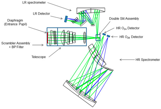 Two different spectral channels with high spectral sampling (0.1–2 nm) have been implemented by means of two spectrometers with spatial co-registration enhanced by design using a common fore-optics with ground spatial sampling of 300 m and swath of 150 km. High efficient anti-reflection coatings, super-polished surfaces, tight particle contamination control and holographic gratings are essential to control the spatial and the spectral stray-light, which have a direct impact on the fluorescence measurement accuracy within the O2 absorption bands. The operative spectral region is selected by a band pass filter, placed in front of the scrambler. Out of band stray-light is also mitigated by using two additional filters, one for each channel, coated on two folding mirrors placed near the double slit assembly. The developed design is robust, stable versus temperature, easy to align and with good optical quality for the whole field of view including excellent corrections of transverse chromatic aberration and distortions (keystone and smile).