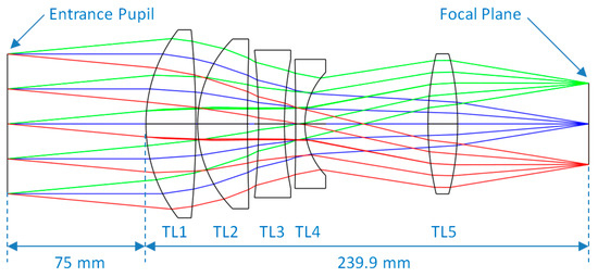 A Petzval objective with 5 lenses (2 aspherical lenses) is used as fore optics (Figure 4). It has a real entrance pupil located 75 mm in front of the first lens, where the instrument aperture stop is accommodated and it is telecentric in the image focal plane. It guarantees good image quality up to F# = 3.1 in the HR spectral band (FOV = ±5.4° × 0.0°) and to F# = 6.5 in the LR spectral band (FOV = ±5.4° × 1.1°). A smaller F# is needed in the HR spectral band for radiometric constraints (lower input radiance and higher spectral resolution with respect to the LR spectrometer). Chromatic aberration correction is achieved with only three radiation resistant glasses (lateral color <4.7 micron in the HR range and <10.5 micron in the LR one). Radial distortion is less than 0.2% and WFE rms is less than 0.23 waves in HR (0.14 waves in LR) channel by design.