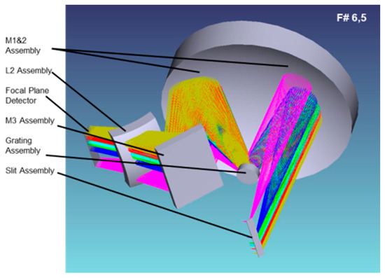 The instrument architecture is based on a push-broom hyperspectral imager with a common telescope and two spectrometers in field separated [8,9].