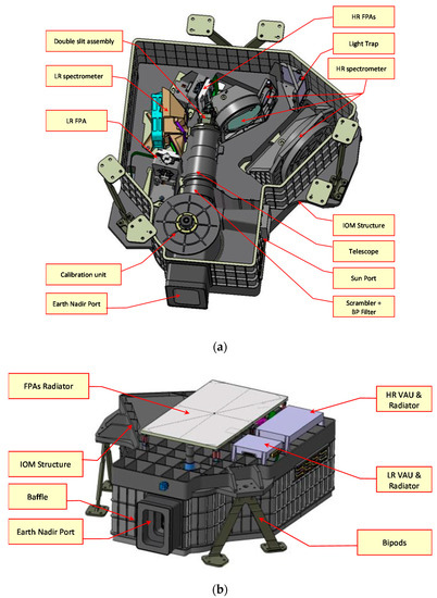 The optical Bench is in Al6061 T6 with optics holders in Titanium or Aluminium for high thermal insulation & stability (Figure 8a). The Earth nadir baffle is also in aluminum and it is divided in three parts: an external fixed one, an internal one within the calibration unit and another internal fixed one in front of the scrambler/Band Pass (BP) filter device. Three white painted radiators cooling the detectors and the VAU’s are mounted on the upper side of instrument (Figure 8b), with a full view to the cold space for optimum SpaceCraft (S/C) accommodation & thermal efficiency. The isostatic mount concept with three titanium bipods at 120 degrees assures the mechanical stability (Figure 8a). The ME is separated by the instrument and is mounted on the S/C payload module.