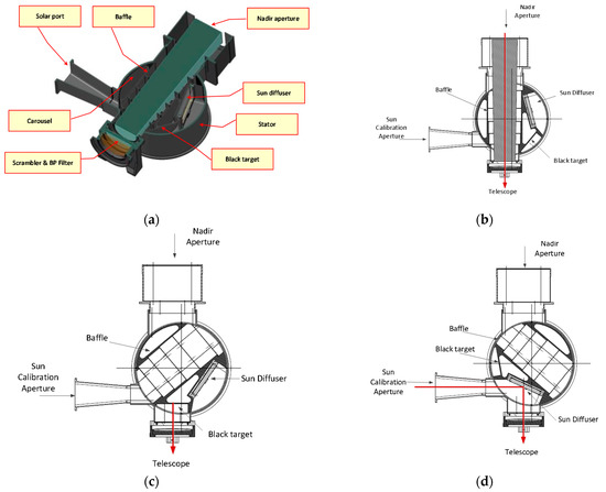 Rotating Calibration Unit internal view (a) and in three different positions: (b) Earth Nadir Observation, (c) Black target observation, (d) Sun diffuser observation through the solar port.