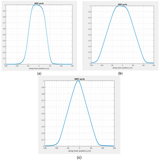 The more stringent requirement for the Spectral Resolution (SR = 0.3 nm) is relevant to the two HR O2 absorption bands 686–697 nm and 759–769 nm (Table 2). This has been achieved by using a slit width of three times (84 μm) the pixel sampling interval (28 μm). A similar concept has been applied for the LR 697–758 nm band. For these HR and LR bands the Spectral Resolution is principally driven by the slit width (Figure 10a). The other HR bands (677–686 nm, 740–759 nm and 769–780 nm) have been obtained by means of ×5 spectral binning performed at VAU level, with a spectral resolution principally driven from the aggregated pixel size (140 μm) (Figure 10b, Table 2). The remaining LR bands (500–697 nm) have been obtained by means of x3 spectral binning at VAU level, with a spectral sampling equal to the slit with (84 μm) (Figure 10c). Finally the Instrument Spectral Response Function (ISRF) is a quasi-trapezoidal function for almost all bands and a quasi-triangular function for the LR 500–697 nm bands (Figure 10a–c). In fact, considering the achieved optical quality, the ISRF can be principally obtained by a convolution between two rectangular functions, representing the slit width of 84 μm and the spectral pixel size after binning ×1, ×3 or ×5, corresponding respectively to 28 μm (Figure 10a), 84 μm (Figure 10c) and 140 μm (Figure 10b).