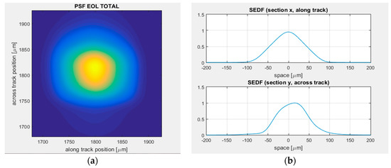 (a) 2D System Energy Distribution Function (SEDF) at the detector focal plane; (b) Along and across-track sections of the SEDF (SSD = 84 μm = 288 m at 805 km altitude).