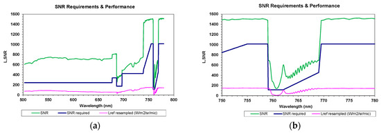 Comparison between SNR requirements and performance: blue curve = SNR requirement, green curve = SNR performance, pink curve = Reference input radiance (W/m2/sr/μm). (a) Total Band, (b) O2A band.