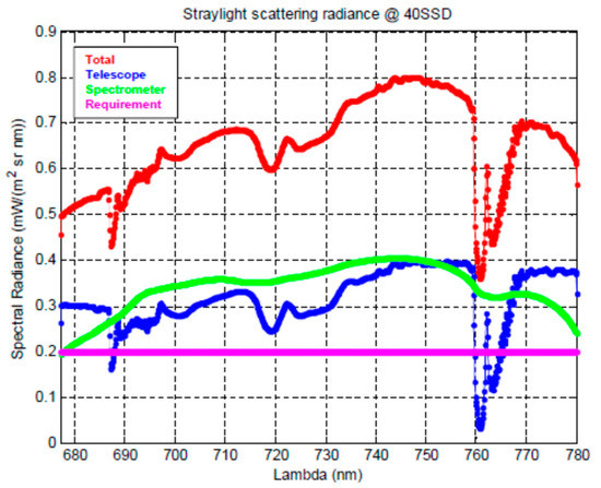 Another fundamental requirement is straylight, which shall be limited (and further reduced with on ground correction algorithms) to avoid pollution of the fluorescence signal. The stray-light signal within the O2A and O2B bands at a distance larger than 40 Spatial Sampling Distance (SSD) from the edge of a transition between a bright (e.g., a cloud) and a dark zone (e.g., the reference vegetation) (Figure 1a) shall be less than 0.04 mW/m2/sr/nm at level 1b (after straylight correction) and 0.2 mW/m2/sr/nm at level L0 (without correction). An important contribution is the spectral stray-light, which comes from the light scattered by the spectrometer optical elements (and the gratings in particular) from the continuum bands into the oxygen bands (Figure 1b). This is affecting measurements even without the presence of bright targets in the scene.