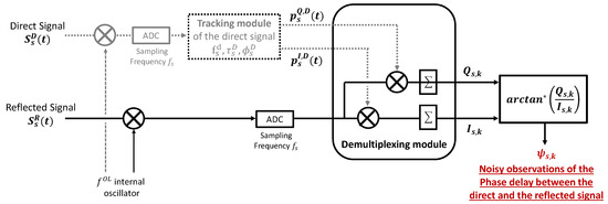 Figure 2 presents the different blocks of the receiver architecture used to observe the phase delay . This receiver architecture is designed as a master/slave configuration as in [18]. The incoming direct and reflected signals, respectively and , are demodulated with an internal oscillator at frequency and digitized with a sampling frequency . The local oscillator frequency is fixed so the residual frequency after down-conversion is both larger than the inverse of the integration interval and lower than half the sampling frequency . The tracking module of the direct signal provides the GNSS parameters , and in order to construct the replicas and . The demultiplexing module described in Figure 2 provides the observations and .