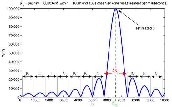The interferometric phase observations are obtained with an initial elevation fixed at and an elevation rate of 0.006/s. This corresponds to a usual case as observed over the city of Calais [7,19]. We compute the RMSE (Root Mean Square Error) of the estimator over 300 realizations of the observations model. Figure 4 presents the obtained RMSE as a function of the integration time along with the theoretical standard deviation of the estimator, calculated using Equation (28).
