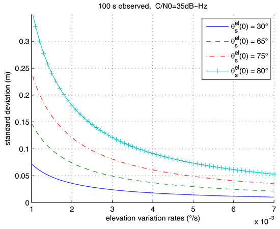We show in Figure 5 the standard deviation of the proposed estimator as a function of the satellite elevation rate and for various initial elevations. For these simulations, the considered observation period is fixed at 100 s, and the is 35 dB-Hz. We observe that the standard deviation of the estimated height decreases when the elevation rate increases, as expected according to Equation (28). Figure 5 also depicts the influence of the initial elevation: the estimator is less precise for high initial elevations, with especially highly increasing precision losses for initial elevations increasing over . High values of the initial elevation indeed provide smaller spans as the sine gets very close to one for any elevation over .