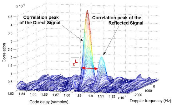 The composite signal (sum of the direct and reflected GNSS signals) is recorded by a Syntony “SiFEn-R-one by one” data grabber. This front-end receiver has a sampling frequency up to 200 MHz and a quantization up to 8 bits. It can be used for any GNSS signal, with adjustable frequency down-conversion. For the experimentation, a sampling frequency of 25 MHz and a quantization of 1 bit were used. The down-conversion frequency is fixed for the frequency of the GPS-L1 band. The additional code delay is fixed at s (1 km of optical fiber), which is sufficient for separating the direct and reflected signals’ correlation peaks for a ground-based experiment with satellites at any observable elevation. Figure 7 presents a Delay-Doppler Mapping (DDM) of a composite signal sensed during the experimentations. The composite signal is processed using the architecture described in Figure 2. The additional delay is taken into account in the local code replica in Equations (7) and (8) by adding it to .