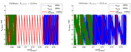 In order to improve the accuracy of the estimated height, we used the fusion operation defined in Equation (25) on the interferometric phase delays obtained for the two satellites. We present on the third line of Table 3 the estimated heights obtained at 15 h 25 min, 15 h 38 min and 15 h 51 min using this technique. The advantage is both to increase the amount of data and to increase the elevation sine span. At 15 h 25 min and 15 h 38 min, the estimated heights are both 1 cm close to the reference height. At 15 h 51 min, the estimated height is 9 cm away from the reference height. This can be explained looking at Figure 11, which shows the observed interferometric phases for Satellites 18 and 21 at 15 h 38 min and 15 h 51 min. In this figure, we observe that the elevation sine span is over two-times smaller at 15 h 51 min than at 15 h 38 min, explaining (through Equation (28)) the accuracy loss.