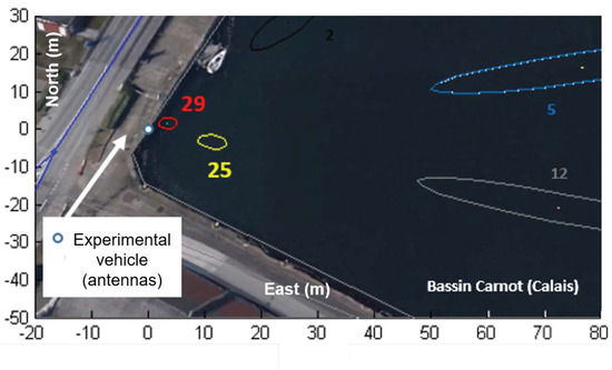 This experimentation on real data is an application of the experimental setup presented in the previous section, the receiver architecture described Section 2.2 and the circular estimator described Section 3.3. The proposed system is tested using the civil component of GPS-L1 signals reflected on an artificial canal basin in Calais. As shown Figure 8, the receiving antennas system, composed of an up-looking RHCP antenna and a down-looking LHCP (Left Hand Circular Polarization)antenna, is located at the top of a telescopic mast. The mast can rise up to a height of 10 m and is mounted on an experimental vehicle. The reference height between the reflecting water surface and the receiving antennas is obtained using a measurement tape.