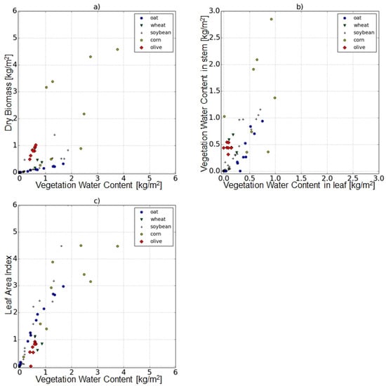 Our primary target is to evaluate how the microwave radiative transfer is sensitive to the vegetation types. Figure 3a–c show that the observed plants have diverse structures. Figure 3a shows that the dry mass and VWC for oat, wheat, soybean, corn, and olive tree. Dry carbon biomass of olive trees is heavier than VWC while dry carbon biomass of other crops (oat, wheat, and soybeans) are often lighter than VWC. Plots of corns are scattered mainly due to sampling errors and decrease in VWC with unchanged dry mass as they were dying. Figure 3b shows that the olive trees and wheat have a larger amount of VWC in stems than oat, soybeans, and corns. Although oat and wheat generally have similar morphology, they have different ratio of VWC in stem to that in leaf probably because they were planted and raised in the different seasons (see Table 1) and they showed different phenology. Figure 3c also shows that the olive trees and wheat have smaller LAI than other crops.