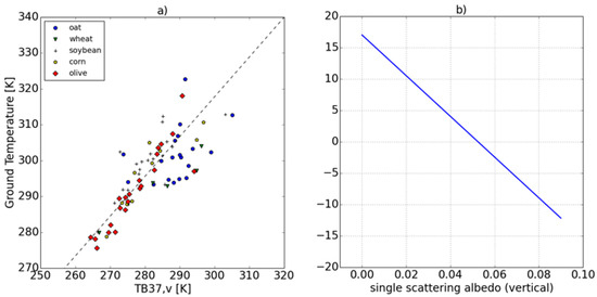 Figure 4a shows the relationship between 36.5 GHz vertical-polarized brightness temperatures and ground physical temperatures for oat, wheat, soybeans, corns, and olive trees. The dashed line indicates the empirical model of [20] (Equation (1)). The empirical relationship of [20] has a good performance to predict our in-situ observed ground temperature data.