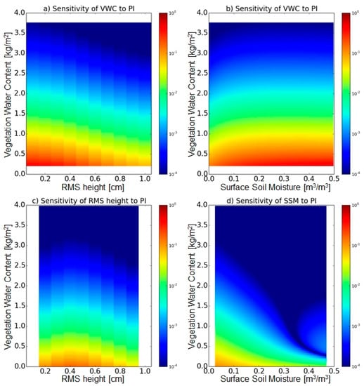 (a) Sensitivity of vegetation water content to PI as a function of RMS height and vegetation water content (surface soil moisture, vertical and horizontal single scattering albedos are set to 0.30 (m3/m3), 0.04, and 0.04, respectively). (b) Same as (a) but as a function of surface soil moisture and vegetation water content (RMS height, vertical and horizontal single scattering albedos are set to 0.1 (cm), 0.04, and 0.04, respectively). (c) Sensitivity of RMS height to PI as a function of RMS height and vegetation water content (surface soil moisture, vertical and horizontal single scattering albedos are set to 0.30 (m3/m3), 0.04, and 0.04, respectively). (d) Sensitivity of SSM to PI as a function of surface soil moisture and vegetation water content (RMS height, vertical and horizontal single scattering albedos are set to 0.1 (cm), 0.04, and 0.04, respectively).