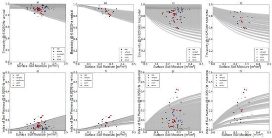 (a–d) Relationship between the surface soil moisture and the emissivity at (a,b) vertical polarized and (c,d) horizontal polarized 6.925 GHz microwave. (a,c) show every plot while (b,d) show the plots with vegetation water content less than 0.20 [kg/m3]. (e–h) same as (a–d) but for ISW. Gray dots are the dataset of the lookup table. We show the lookup table with every other bin for single scattering albedos and a RMS height for brevity.