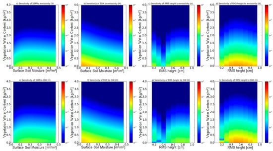 (a,b) Sensitivity of surface soil moisture to emissivity of (a) vertical polarized and (b) horizontal polarized microwave as a function of surface soil moisture and vegetation water content (RMS height, vertical and horizontal single scattering albedos are set to 0.1 (cm), 0.04, and 0.04, respectively). (c,d) Sensitivity of RMS height to emissivity of (c) vertical polarized and (d) horizontal polarized microwave as a function of RMS height and vegetation water content (surface soil moisture, vertical and horizontal single scattering albedos are set to 0.3 (m3/m3), 0.04, and 0.04, respectively). (e,f) Same as (a,b) but for ISW. (g,h) Same as (c,d) but for ISW.