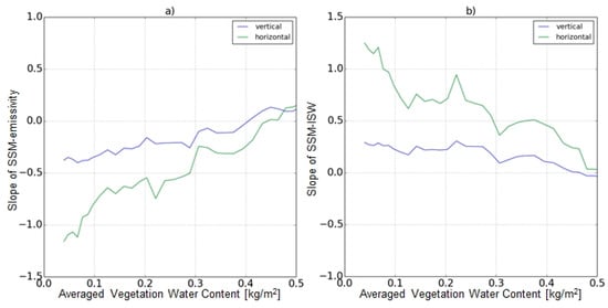 Slope of the linear regression between (a) 6.925 GHz emissivity and surface soil moisture, and (b) 6.925 GHz and 37 GHz ISW and surface soil moisture as a function of averaged vegetation water content among 20 observations sampled from our in-situ observations. Blue and green lines show the results of vertical polarized and horizontal polarized microwave, respectively. See manuscript for the details of this analysis.